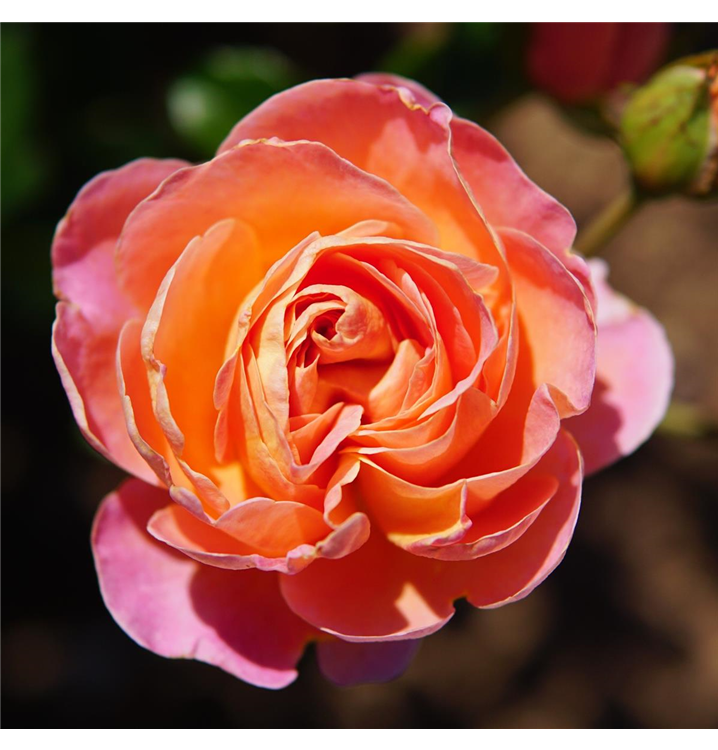 Die rosa-gelben, schalenförmigen Blüten sind gefüllt und erscheinen von Juni bis Oktober. Diese werden etwa 8 - 10 cm groß und sind angenehm duftend.