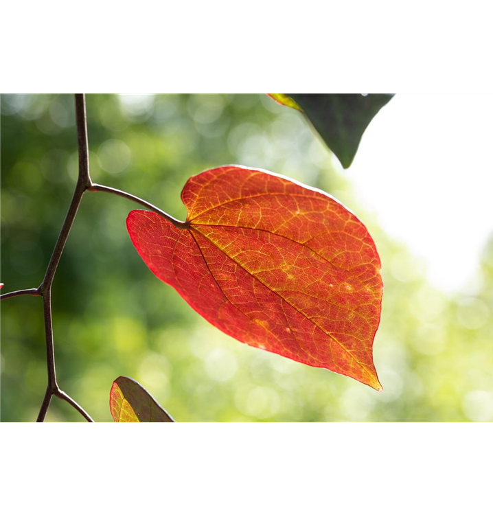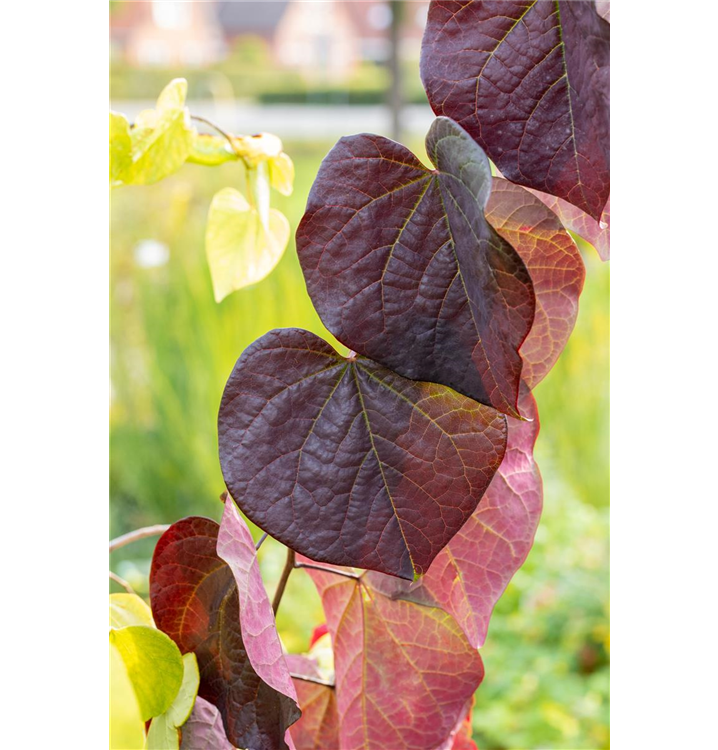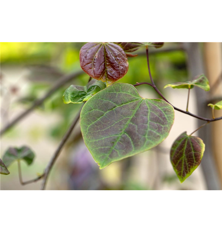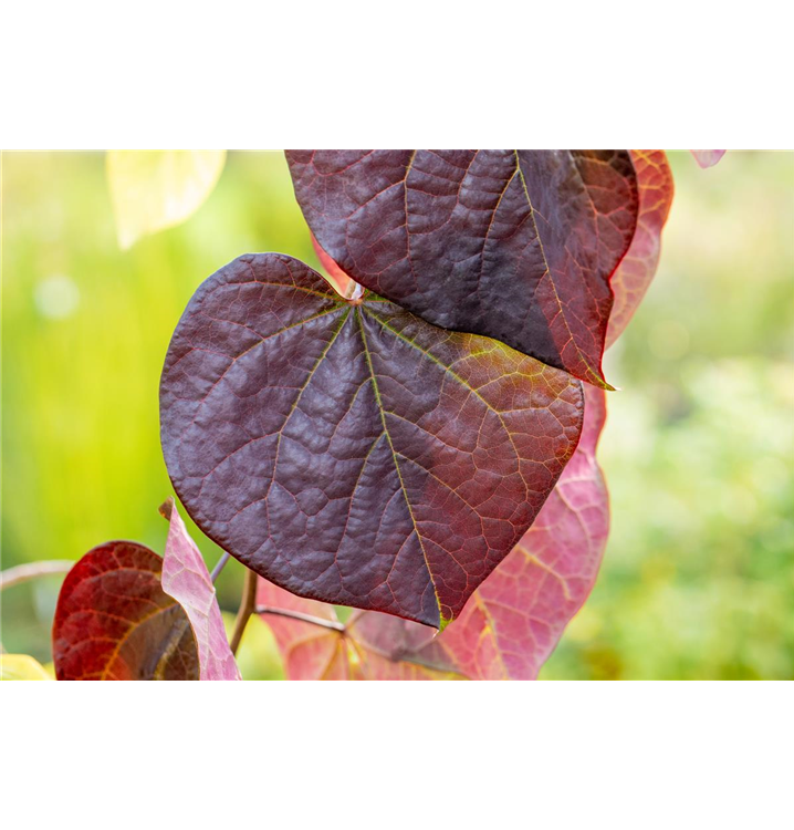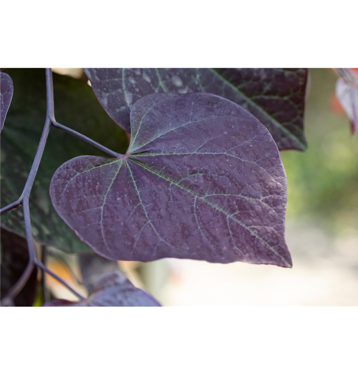 Hoher Blattschmuckwert. Die sommergrünen Blätter der Kanadischer Judasbaum 'Ruby Falls' sind dunkelrot, herzförmig, wechselständig. Diese sind etwa 8 - 14 cm groß.