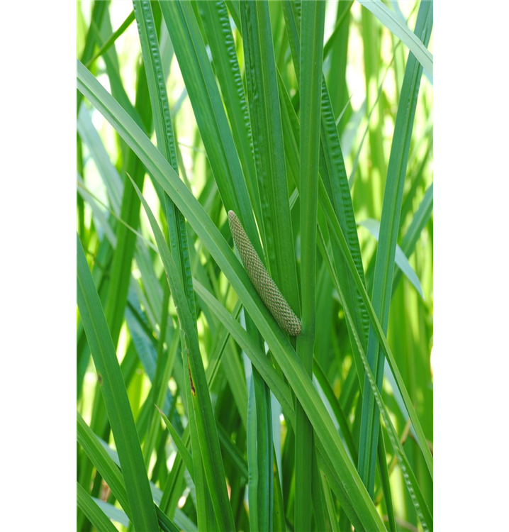 Der Kolbenblütige Kalmus (Acorus calamus) ist mit seinen mittelgrünen Blättern eine ausgesprochen dekorative Wasserpflanze, die für solche Einsatzbereiche wie Teichrand, Bachlauf, Kübel und Teich besonders gut geeignet ist. Die Blüten erscheinen, je nach Sorte, in vielen Farben von Juni bis Juli. Er bevorzugt nährstoffreichen Boden in sonniger bis halbschattiger Lage. Der Kolbenblütige Kalmus ist gut frostverträglich. Die aufrechte, ausläuferbildende Staude erreicht gewöhnlich eine Höhe von ca. 80 cm.
