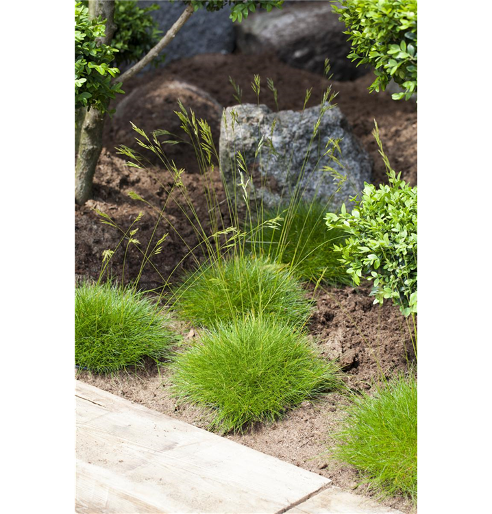Die Zwergiger Bärenfell-Schwingel 'Pic Carlit' (Festuca gautieri) ist mit ihrer mittelgrünen Blattfärbung ein dekoratives Gestaltungselement im Garten, welches sich an einem sonnigen bis halbschattigen Standort mit einem möglichst durchlässigen Boden am wohlsten fühlt. Die gelb-grünen Blütenwedel schmücken die polsterbildend und kompakt wachsende Pflanze ab Sommer. Bei günstigen Bedingungen erreicht dieses winterharte Gras eine Höhe von ca. 15 cm und wird bis zu 20 cm breit.