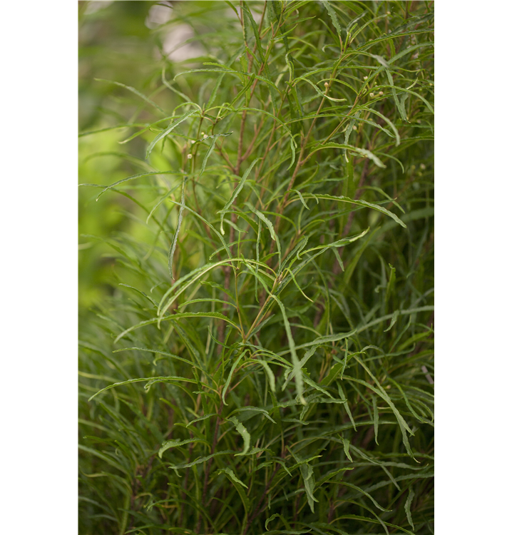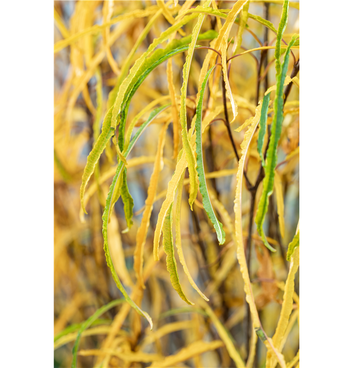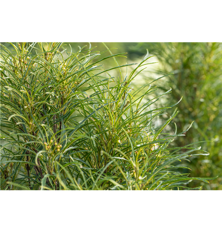 Hoher Blattschmuckwert. Die sommergrünen Blätter des Farnblättrigen Faulbaums 'Fine Line'® sind mittelgrün, lanzettlich, glänzend, wechselständig. Diese sind etwa 10 - 15 cm groß. Farnblättriger Faulbaum 'Fine Line'® zeigt sich leuchtend goldgelb im Herbst.