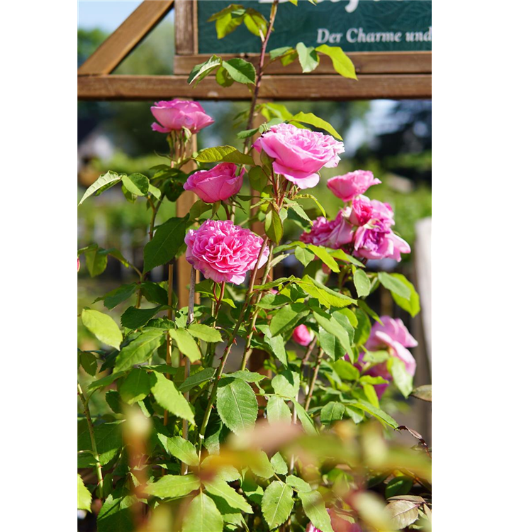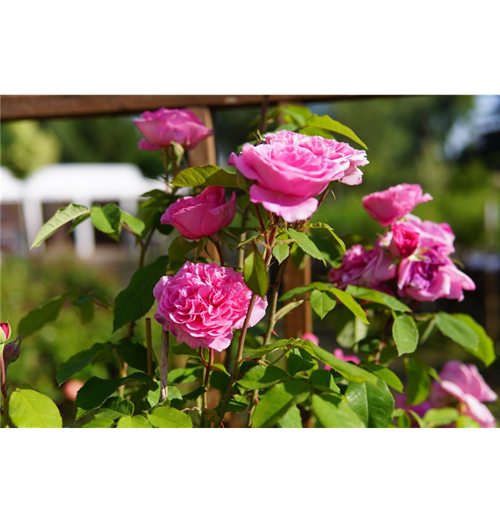 Die Englische Strauchrose 'Gertrude Jekyll'® (Rosa) begeistert im Garten mit ihrer üppigen Blütenpracht. Von Juni bis Oktober erstrahlen ihre zahlreichen stark gefüllten, rosa Blüten und verleihen dem Garten eine romantische Atmosphäre. An sonnigen Tagen entfaltet sich ihr intensiver Duft besonders eindrucksvoll. Mit ihrem buschigen und aufrechten Wuchs erreicht diese Strauchrose eine Höhe von bis zu 1,2 Metern und eine Breite von 1,5 Metern, was sie zu einem markanten Blickfang macht.