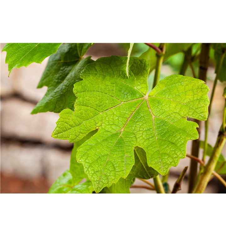 Die sommergrünen Blätter der Tafeltraube 'Vanessa'® sind dunkelgrün, herzförmig, gezähnt. Tafeltraube 'Vanessa'® zeigt sich leuchtend kupfergelb bis rot im Herbst.