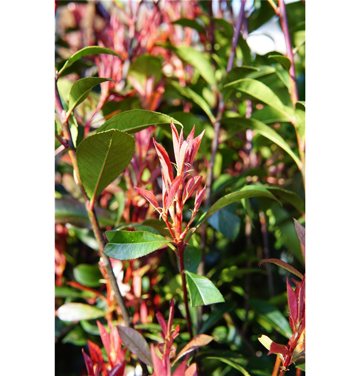 Die immergrünen Blätter der Glanzmispel 'Carré Rouge' sind dunkelgrün, lanzettlich, glänzend. Roter Austrieb.