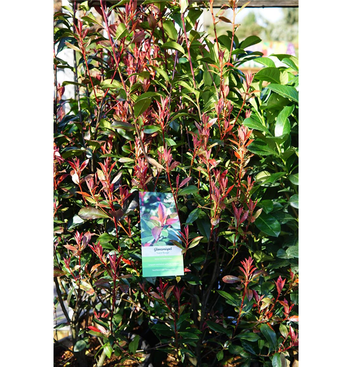 Die Glanzmispel 'Carré Rouge' (Photinia fraseri) ist eine strauchartige Gartenpflanze, die weiße Blüten hervorbringt. Sie erscheinen von April bis Mai. Zudem trägt die Glanzmispel 'Carré Rouge', glänzende, lanzettliche, dunkelgrüne Blätter. Auch der rote Austrieb ist sehr schön. An einem sonnigen bis halbschattigen Standort mit durchlässigem, schwachsaurem Boden erreicht sie gewöhnlich eine Höhe von ca. 2 m und wird ca. 1,5 m breit.