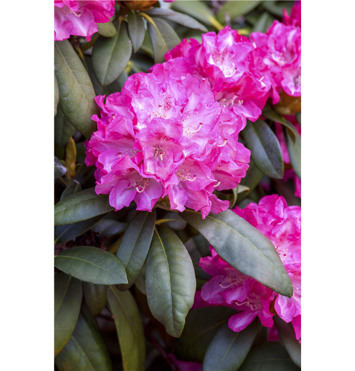 Der Rhododendron 'Anuschka' ist immergrün und trägt dunkelgrüne lanzettliche Blätter.
