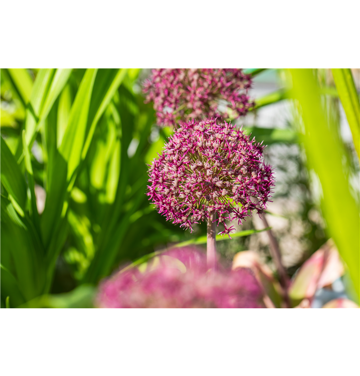 Der Zierlauch 'Ostara' (Allium) bringt ansehnliche, purpurviolette Blüten von Mai bis Juni hervor. Bevorzugt wird ein durchlässiger, humoser, nährstoffreicher Boden in sonniger Lage. Die aufrechte, kompakte Pflanze erreicht gewöhnlich eine Höhe von 30 - 40 cm und wird bis zu 30 cm breit.