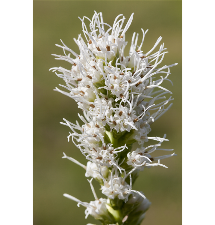 Liatris spicata 'Alba' bildet in Ähren angeordnete, weiße Blüten ab Juli.