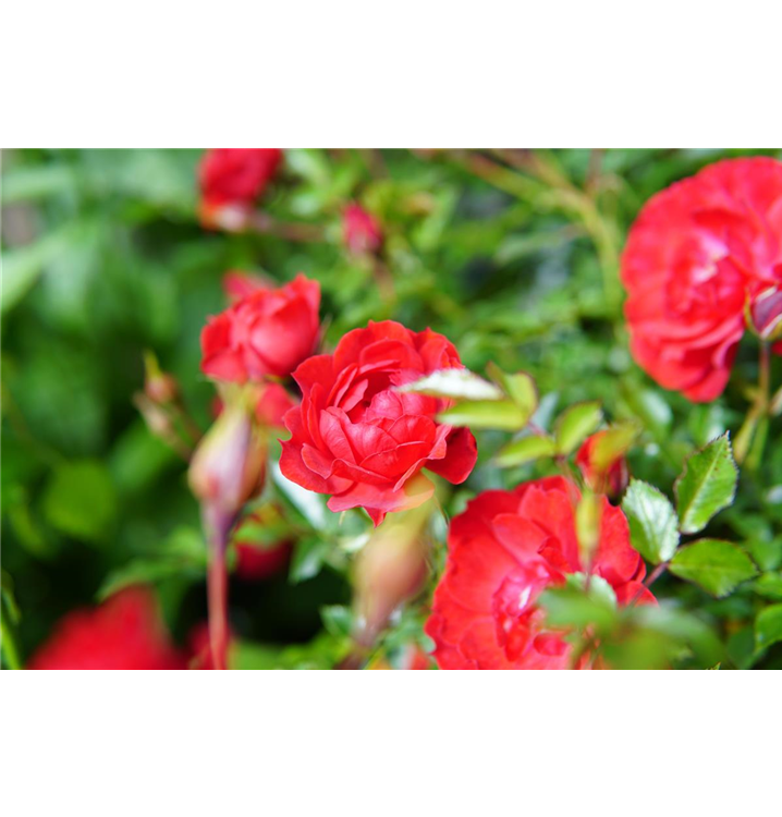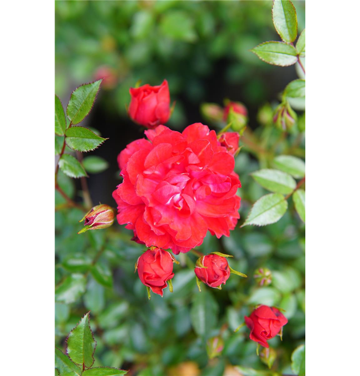 Die sommergrünen Blätter der Bodendeckerrose 'Limesglut'® sind dunkelgrün, gefiedert, wechselständig.