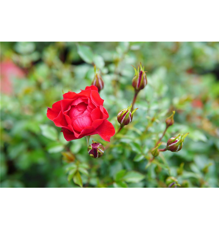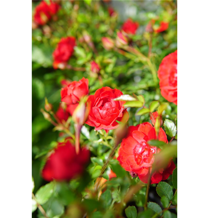 Die Bodendeckerrose 'Limesglut'® (Rosa) ist eine reichblühende Rose, die im Garten eine besondere Rolle spielt. Die zahlreichen gefüllten Blüten sind blutrot und erscheinen von Juni bis Oktober. Mit dem breiten, flachen und kompakten Wuchs wird dieser Zwergstrauch bis zu 50 cm hoch und 1 m breit.