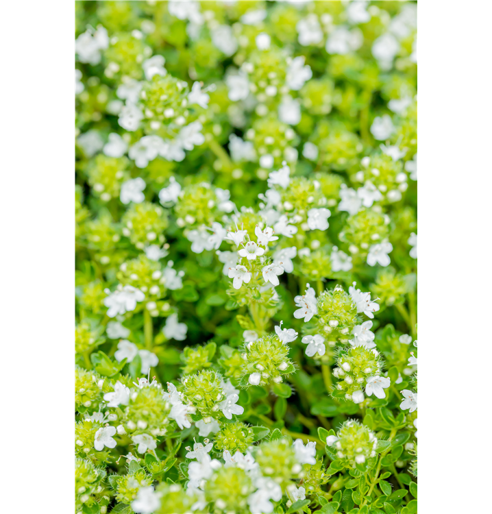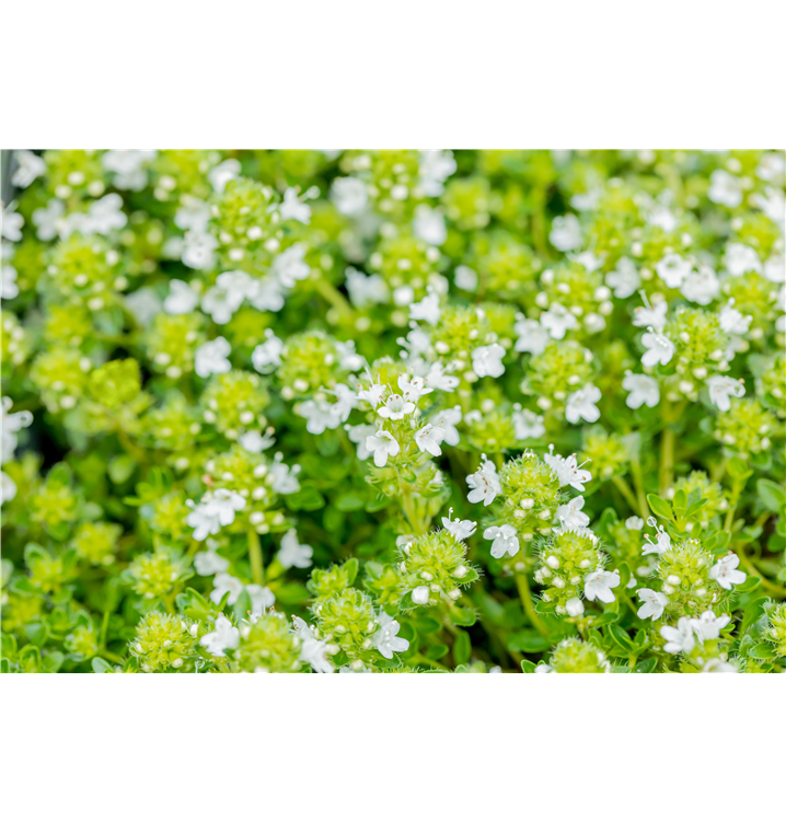 Der Frühblühende Thymian 'Albiflorus' (Thymus praecox) ist eine teppichartige, immergrüne Staude, die von Juli bis August weiße, in Quirle angeordnete Blüten mit einem angenehmen Duft bildet. An einem sonnigen Standort mit durchlässigem, humosem, sandigem Boden erreicht er gewöhnlich eine Höhe von ca. 6 cm und wird ca. 25 cm breit. Der Frühblühende Thymian 'Albiflorus' ist gut frostverträglich.
