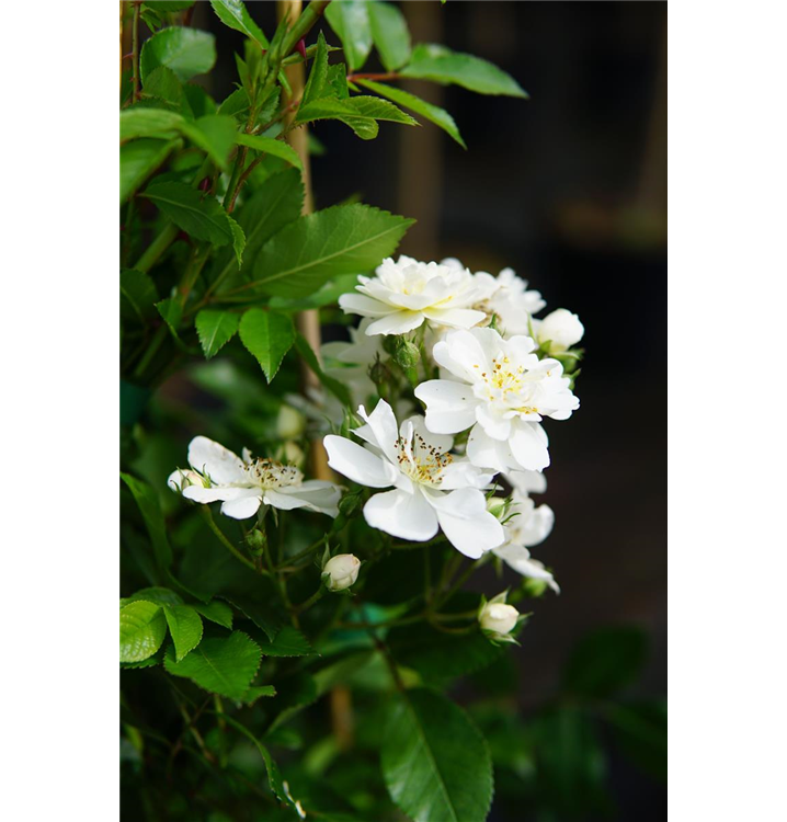 Die Kletterrose 'Guirlande d'Amour'® (Rosa) ist eine reichblühende Rose, die im Garten eine besondere Rolle spielt. Die zahlreichen Blüten sind weiß und erscheinen von Juni bis Oktober. Ihr wunderbarer Duft entfaltet sich besonders an sonnigen, warmen Tagen. Mit dem kletternden Wuchs wird dieses Gehölz bis zu 3 m hoch und 1 m breit.