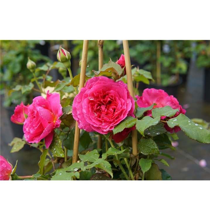 Die Englische Rose 'Gabriel Oak'® (Rosa) ist eine reichblühende Rose, die im Garten aber auch auf Balkon oder Terrasse eine besondere Rolle spielt. Die zahlreichen starkgefüllten Blüten sind magenta und erscheinen von Juni bis Oktober. Ihr intensiver Duft entfaltet sich besonders an sonnigen, warmen Tagen. Mit dem aufrechten Wuchs wird dieser Kleinstrauch bis zu 1,2 m hoch.