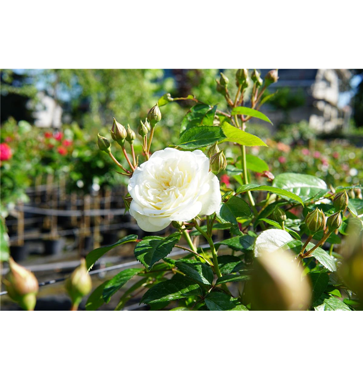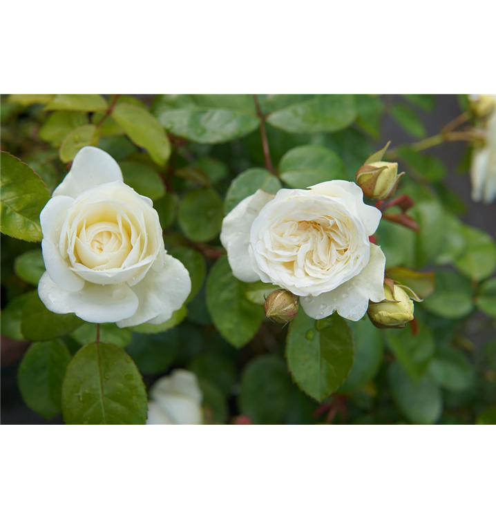 Die weißen, gefüllten, schalenförmigen Blüten der Beetrose 'Marina Picasso'® erscheinen in Dolden von Mai bis Oktober. Diese sind leicht duftend.