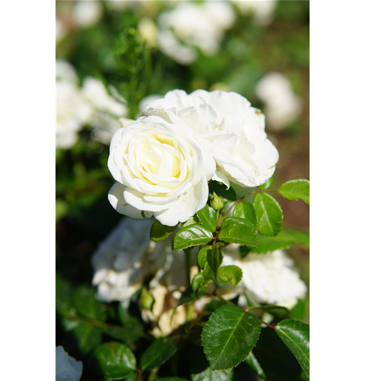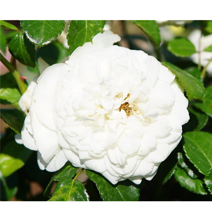 Die Beetrose 'Marina Picasso'® (Rosa) ist eine reichblühende Rose, die im Garten eine besondere Rolle spielt. Die zahlreichen gefüllten Blüten sind weiß und erscheinen von Mai bis Oktober. Ihr zarter Duft entfaltet sich besonders an sonnigen, warmen Tagen. Mit dem buschigen und kompakten Wuchs wird dieser Kleinstrauch bis zu 1 m hoch und 60 cm breit.