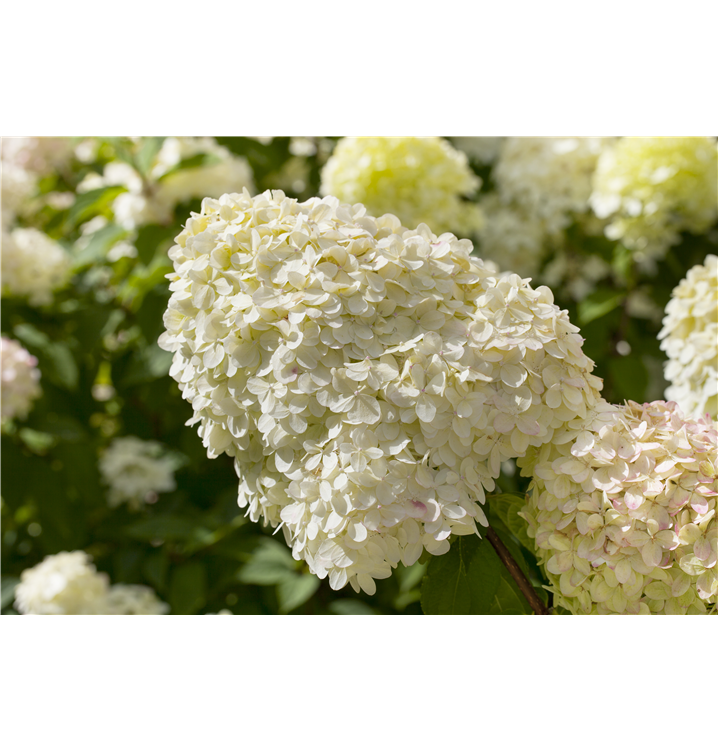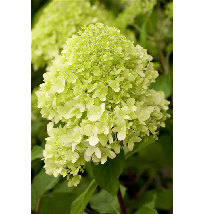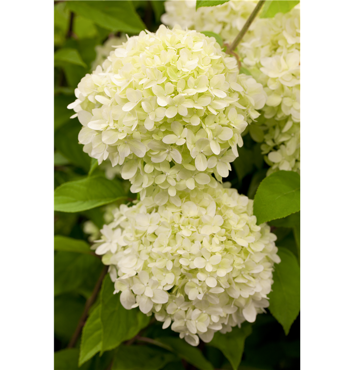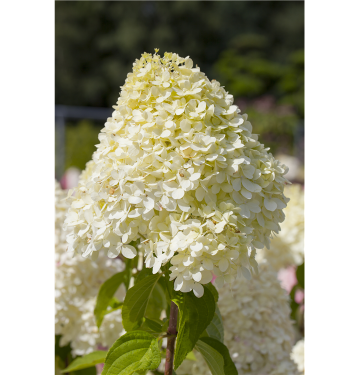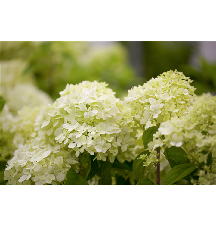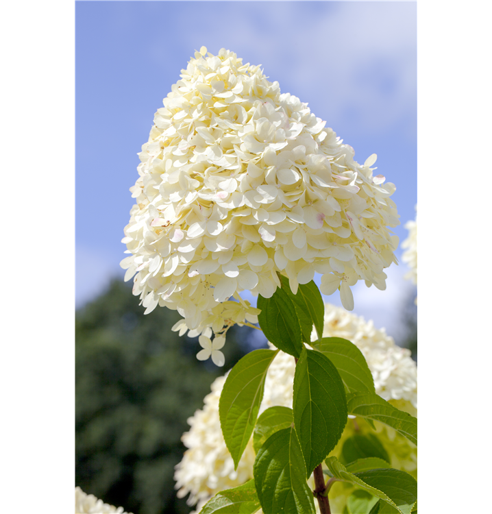 Zudem trägt die Rispenhortensie 'Limelight'(s), lanzettliche, dunkelgrüne Blätter. An einem sonnigen bis halbschattigen Standort mit durchlässigem, humosem Boden erreicht sie gewöhnlich eine Höhe von ca. 2,5 m und wird ca. 2,5 m breit.