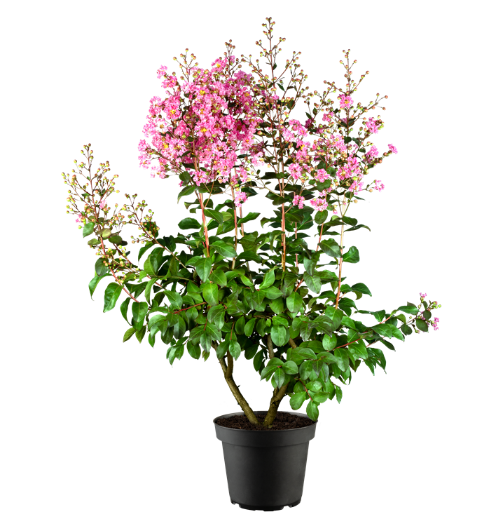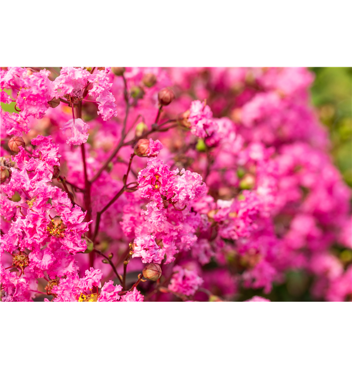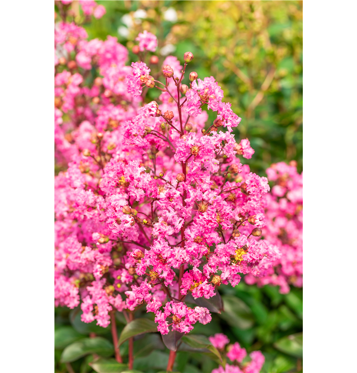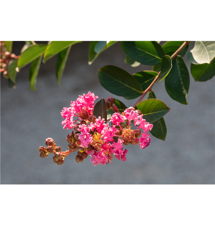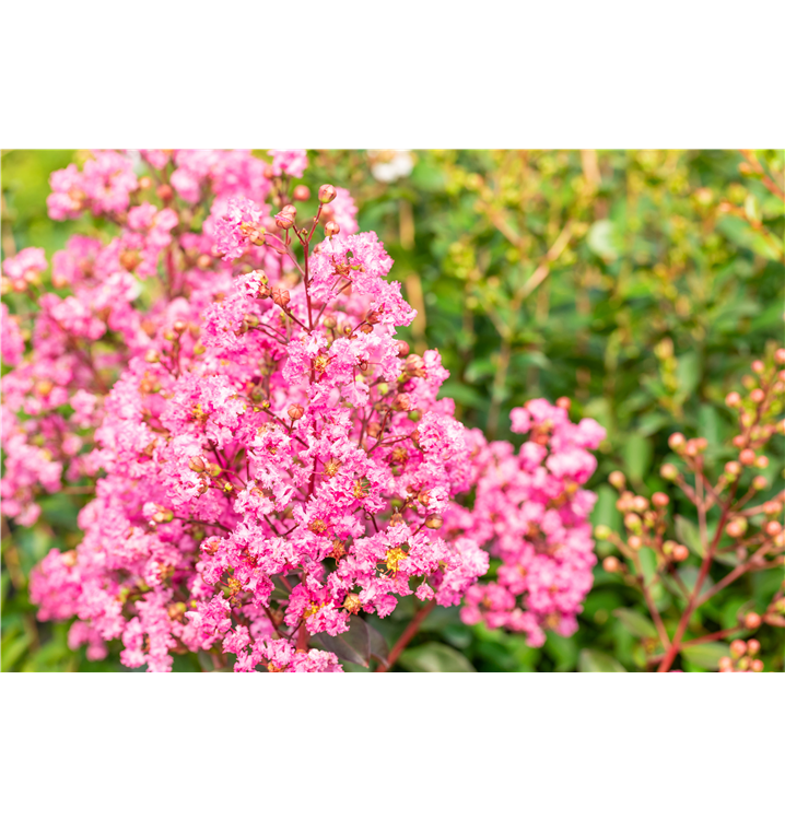 Lagerstroemia indica 'Rhapsody in Pink'® bildet pinke Blüten ab Juli.